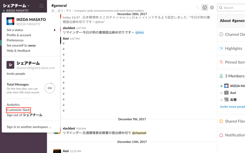 まずはSlackカスタマイズ画面から