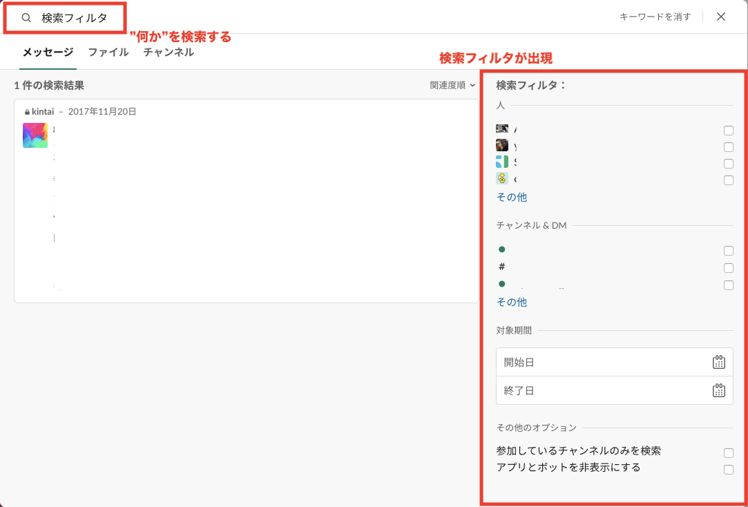 しかし、「このチャンネル内から検索したい」等、条件をつけて検索したい場合には、絞り込みの検索結果を出してほしいですよね。