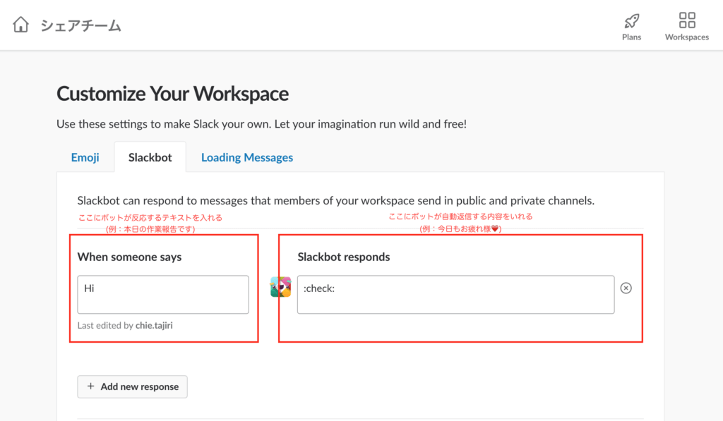 その横に、ボットで返信する言葉を入れます。