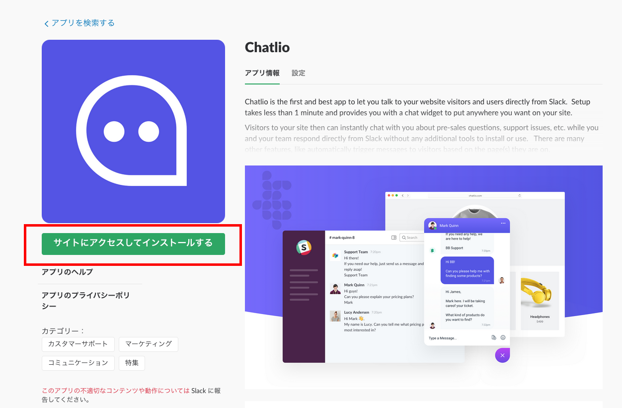 SlackとChatlioの連携はとても簡単です。はじめに、SlackのAppディレクトリから、Chatlioを見つけましょう。Chatlioが見つかったら、Chatlioのアイコン下に表示されている「サイトにアクセスしてインストールする」をクリックしましょう。