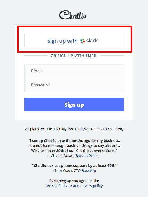ChatlioのWebページトップが表示されるので「Sign up using Slack」をクリックします。