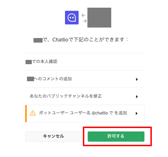 使用しているPCで既にSlackにログインしている場合は、そのまま確認画面に進みましょう。そして、ChatlioがSlack上でできる内容を確認し「許可する」をクリックします。