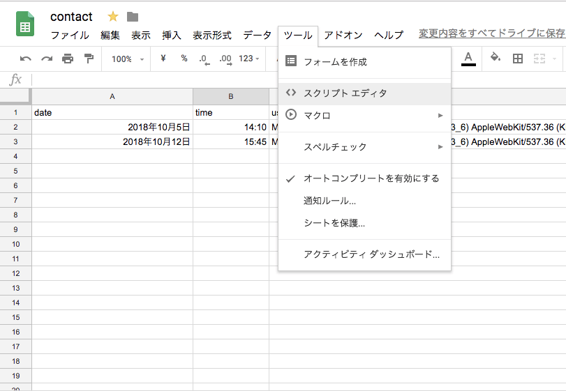 先ほどのスプレッドシートを開き、
