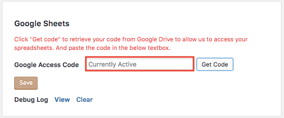 コピーしたコードを先ほどの「Google Sheets」の「Google Access Code」に貼り付け、「Save」を押します。