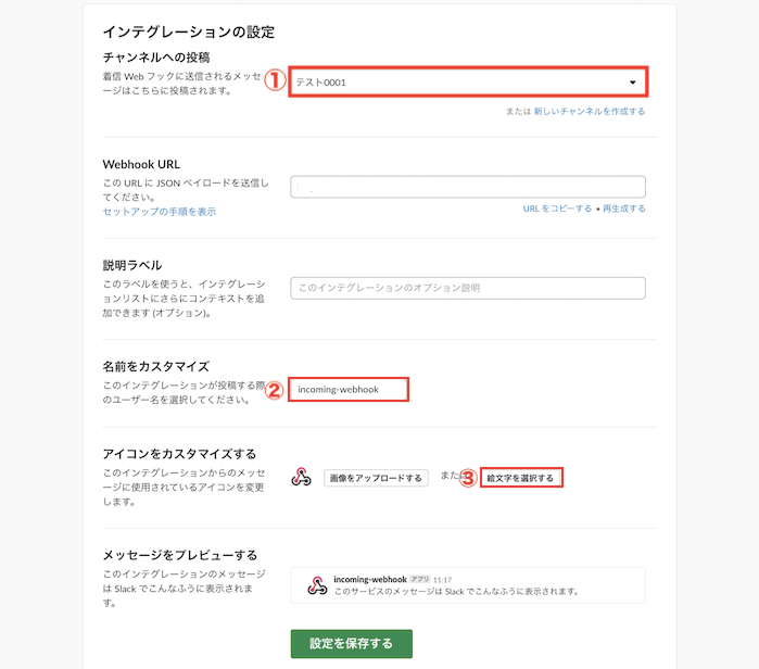 ③”2-1.『Incoming WebHooks』をSlackと連携する”でコピペしたWebhookのURLをペースト
