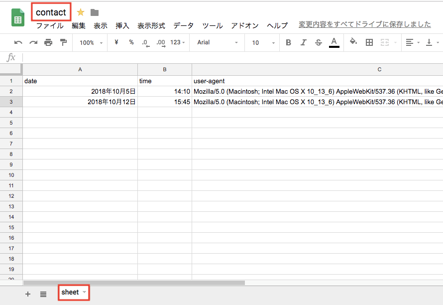 これで、お問い合わせメッセージがスプレッドシートに表示されるようになりました!