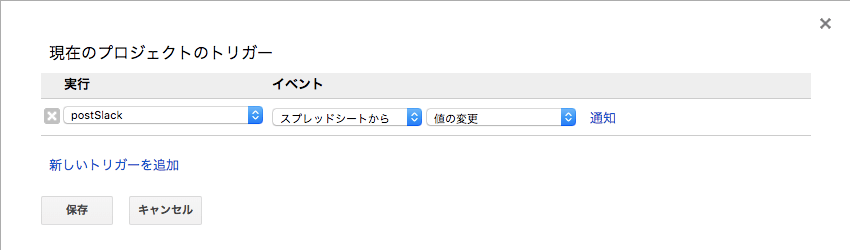 そして、スプレッドシートにお問い合わせが更新されたら、Slackに通知が飛ぶように設定してみます。
