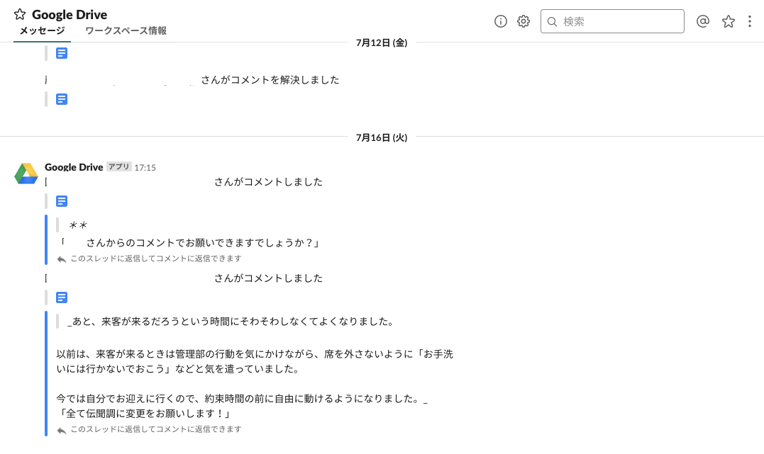 AppからGoogle Driveを追加すると、ファイルに何らかの動きがあった場合Slack上ですぐに通知を受け取ることができます。
