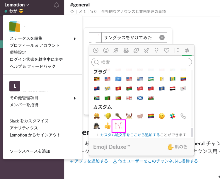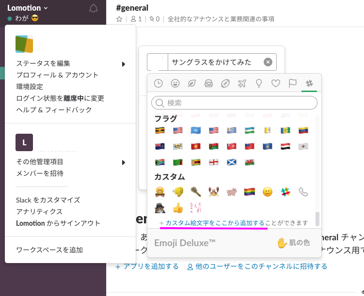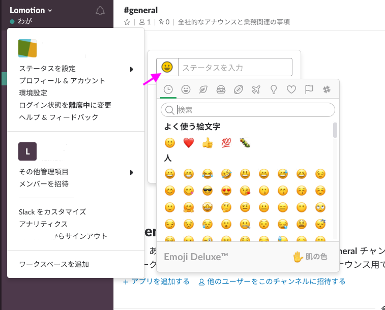 先ほどと同じように、「ステータスを編集(管理者はステータスを設定)」を押し、顔のマークを押すと、自分の好きな絵文字を選べます。