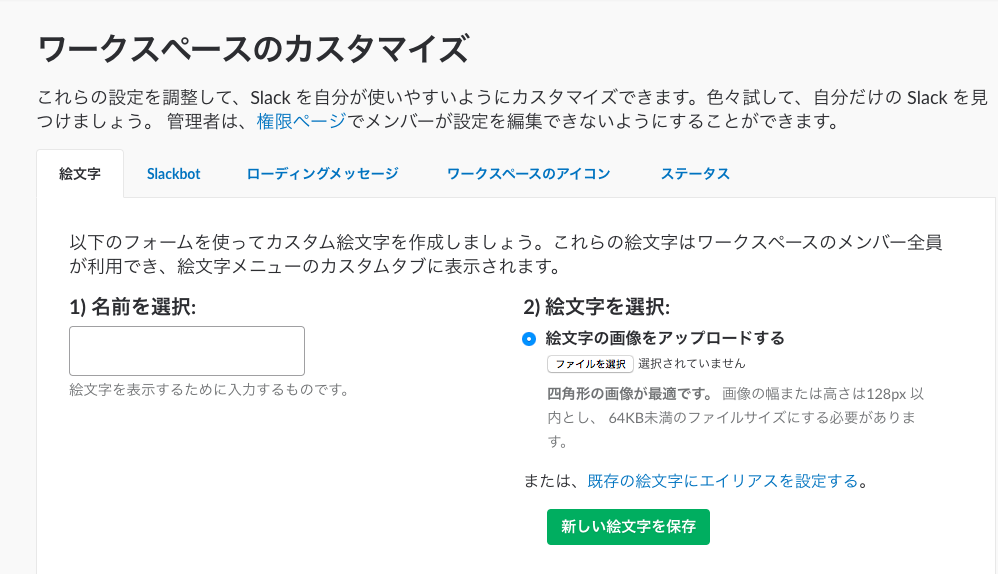 ここに、名前を選択し、絵文字の画像をアップロードすれば、