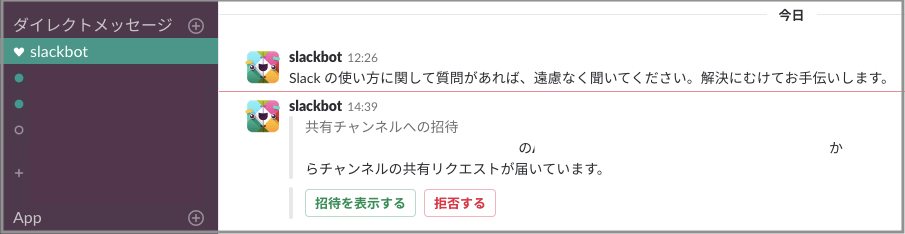 招待されたとき、Slackbotからメッセージが届きます。
