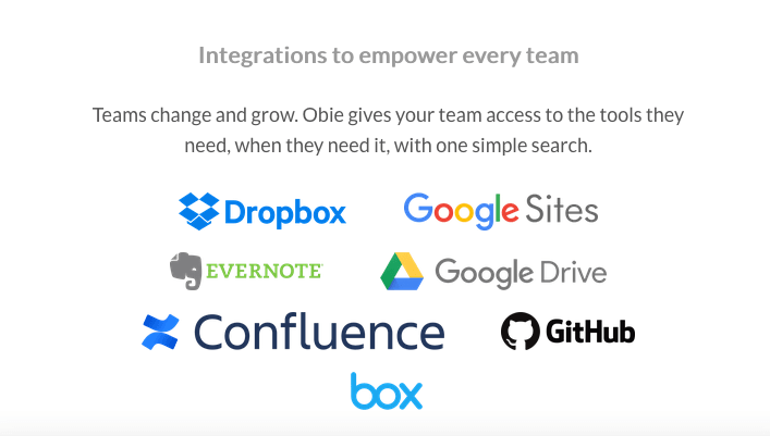 Obie.AIは、「Dropbox」や「Google Drive」「EVERNOTE」「GitHub」など複数の外部機能と連携が可能で、それらの中からも情報を検索できます。