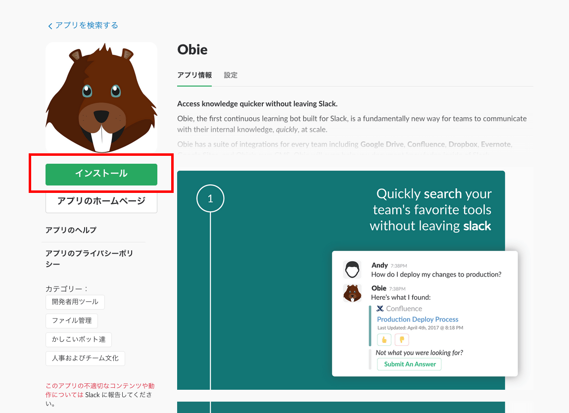 SlackとObie.AIを連携させるには、まず、Slack内のAppディレクトリにある検索機能を使って、Obieのインストールページにアクセスしましょう。