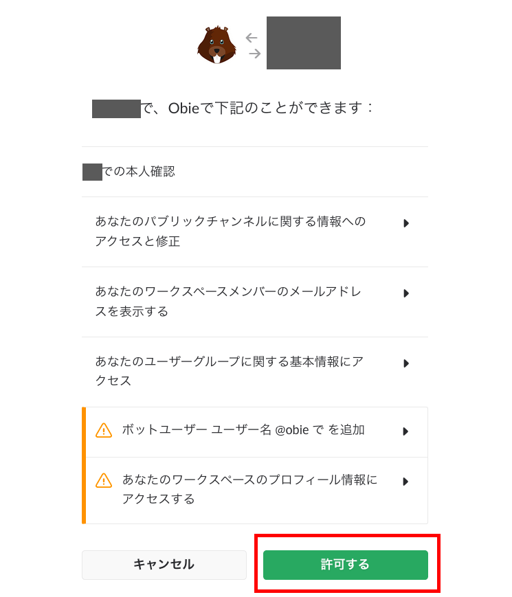 「〜〜(ワークスペース名)で、Obieで下記のことができます:」との表示があらわれます。その下に「〜〜(ワークスペース名)での本人確認」との表示と、Obieでできることの詳細が確認できるので、それらを確認したら、下側にある「許可する」をクリックしましょう。