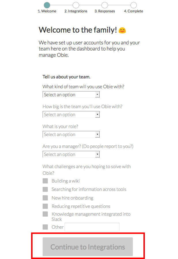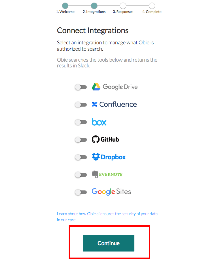 該当するものを選んだら、下にある「Continue to Integraions」をクリックします。今度は、Obie.AIと連携させたい外部機能を選び、下にある「Continue」をクリックします。もちろん、ここで連携させたい外部機能がない場合は、チェックを入れなくても問題ありません。