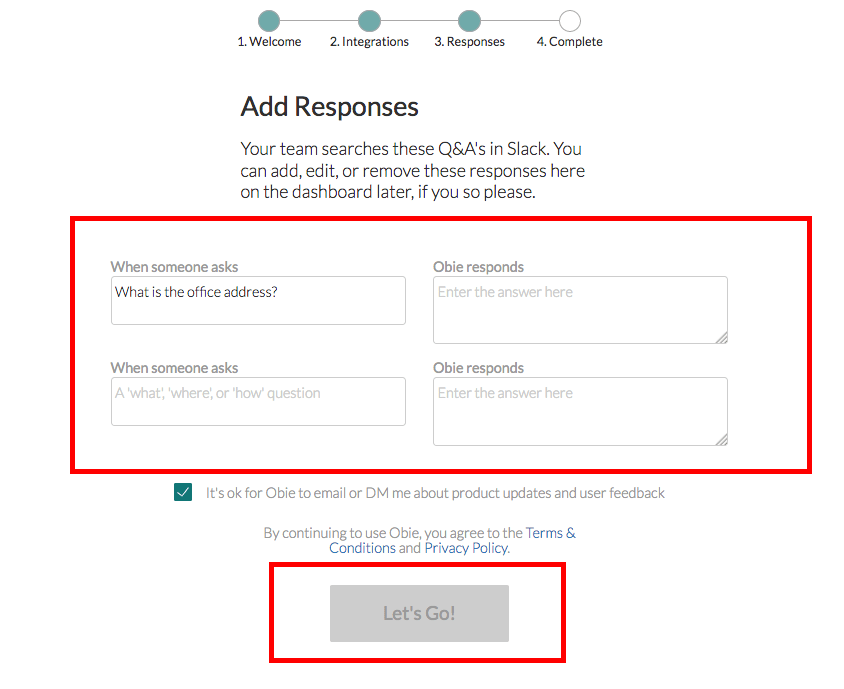 Slack上で問い合わせがあった時にObieが答える内容を作成していき、Q&Aの内容を作成したら下にある「Let’s Go!」をクリックし完成です。