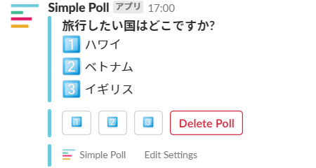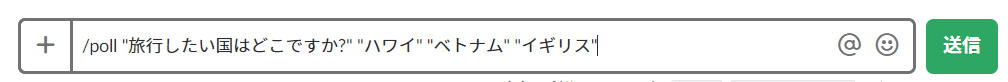 これに、「/poll “旅行したい国はどこですか?” “ハワイ” “ベトナム” “イギリス”」と入力すると、アンケートが作成されます。