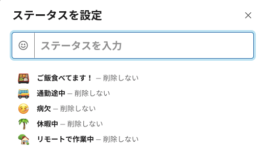 ↑左上のワークスペース▽から「ステータスを設定」を選択。自分の好きなマークも選択できる。