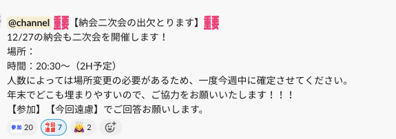 社内清掃に関してや懇親会の予定などチャンネル内の全員にお知らせしたい事柄があるときにはとても便利な@channnel機能です。