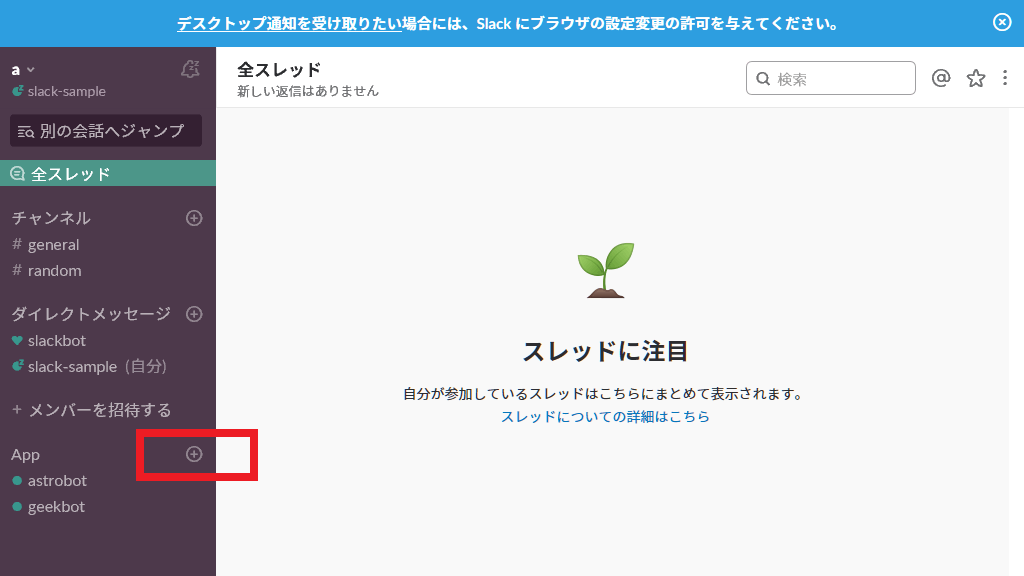 1. Slackの画面左下部にある「App」の+アイコンをクリックします。