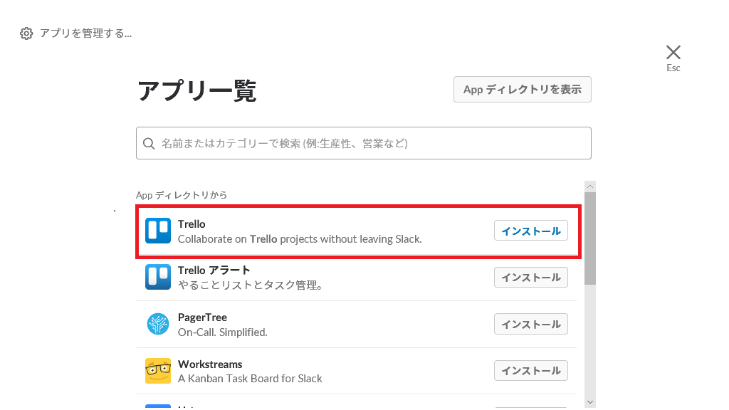 3. 検索をかけると、アプリ一覧画面の一番上に「Trello」が表示されるので、右側の「インストール」ボタンをクリックします。