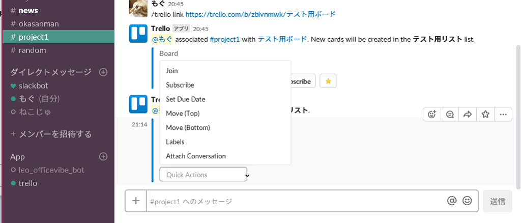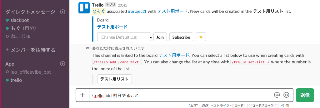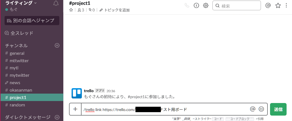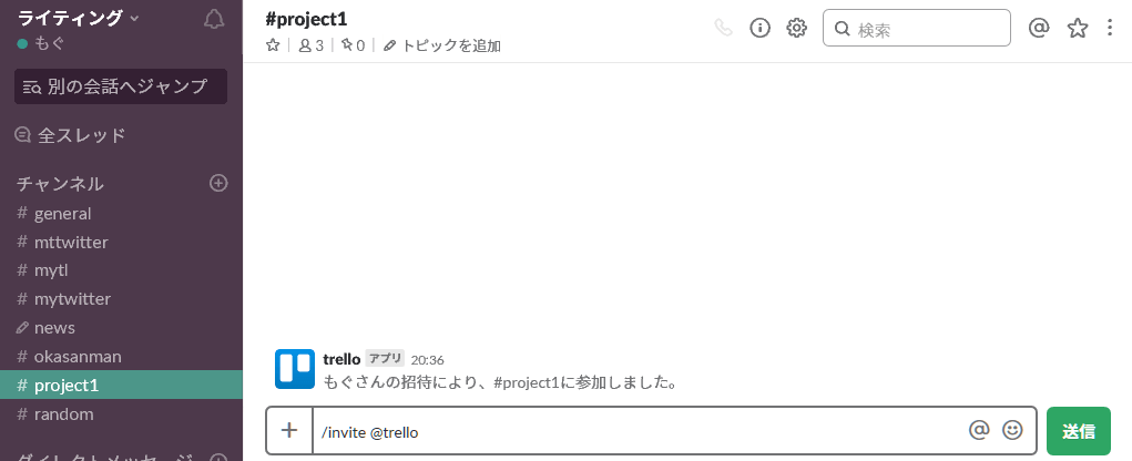 画像の例では、#project1 チャンネルで、Trelloを使えるようにしています。