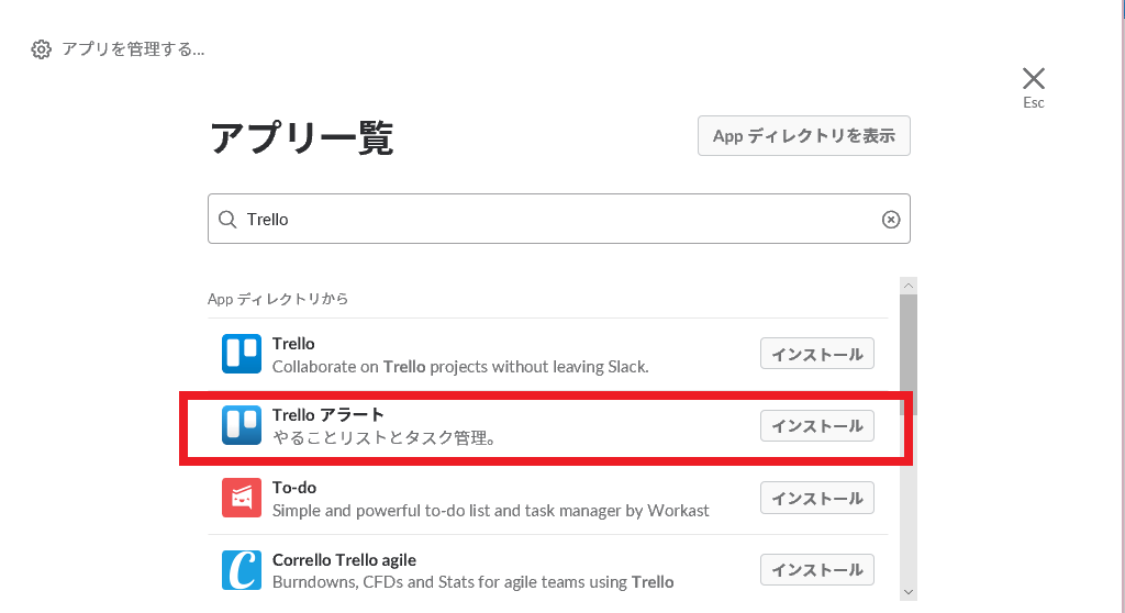 1. アプリ一覧から検索するとき、Trelloの下に表示されている「Trelloアラート」をインストールします。