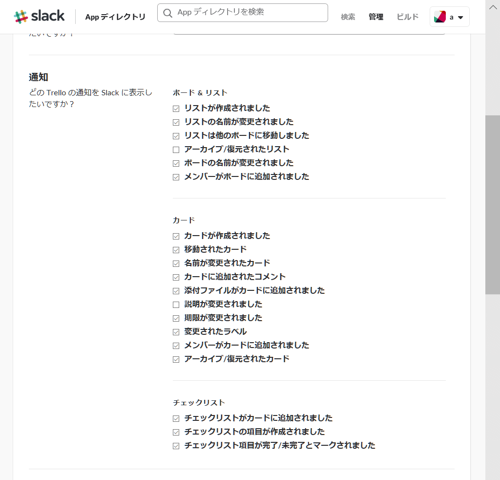3. この画面の下部でTrelloの通知のうち、どの通知をSlackにも通知するかを選択します。基本的には操作をすべて通知するようにしておき、邪魔になる通知を切っていくという設定がおすすめです。