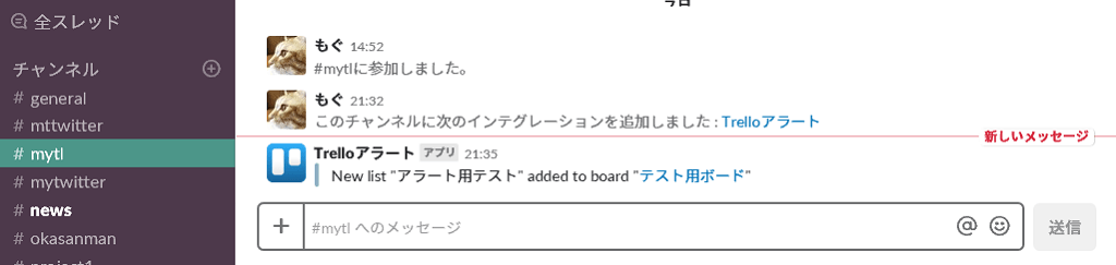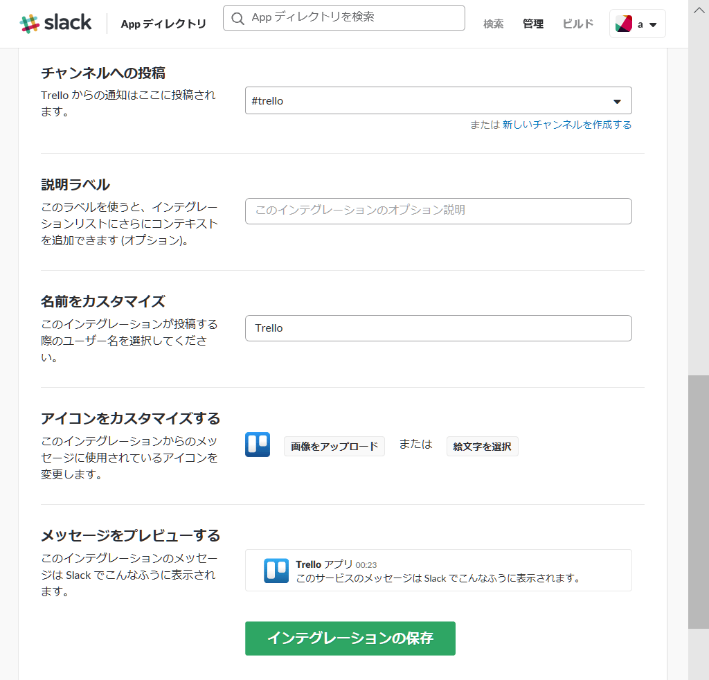 最後に「インテグレーションの保存」ボタンを押すと、設定は保存され、Trelloの通知がSlackに送られるようになります。