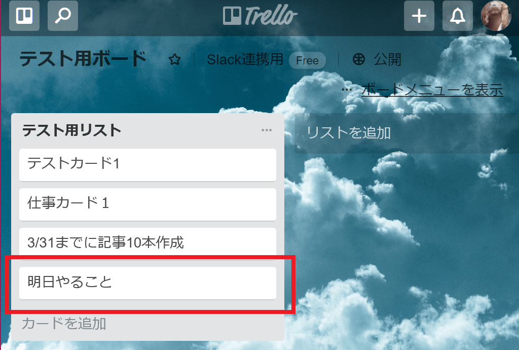 3. Slack上でもカードが作成されたことが表示され、Trelloのボード画面でも、指定したカードが追加されたことが確認できれば成功です。