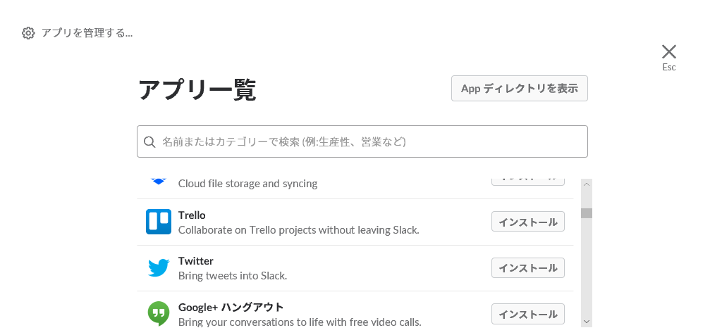 2.するとアプリ一覧が出てくるので、Twitterを選択しましょう。それによりTwitterの連携を問う画面に遷移するので「インストール」ボタンを押して先に進みます。