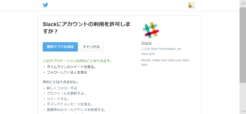 3.Twitterのアカウントに対して、Slackにアカウントの利用許可をするかどうかのダイアログが出るので、「連携アプリを認証」ボタンを押します。