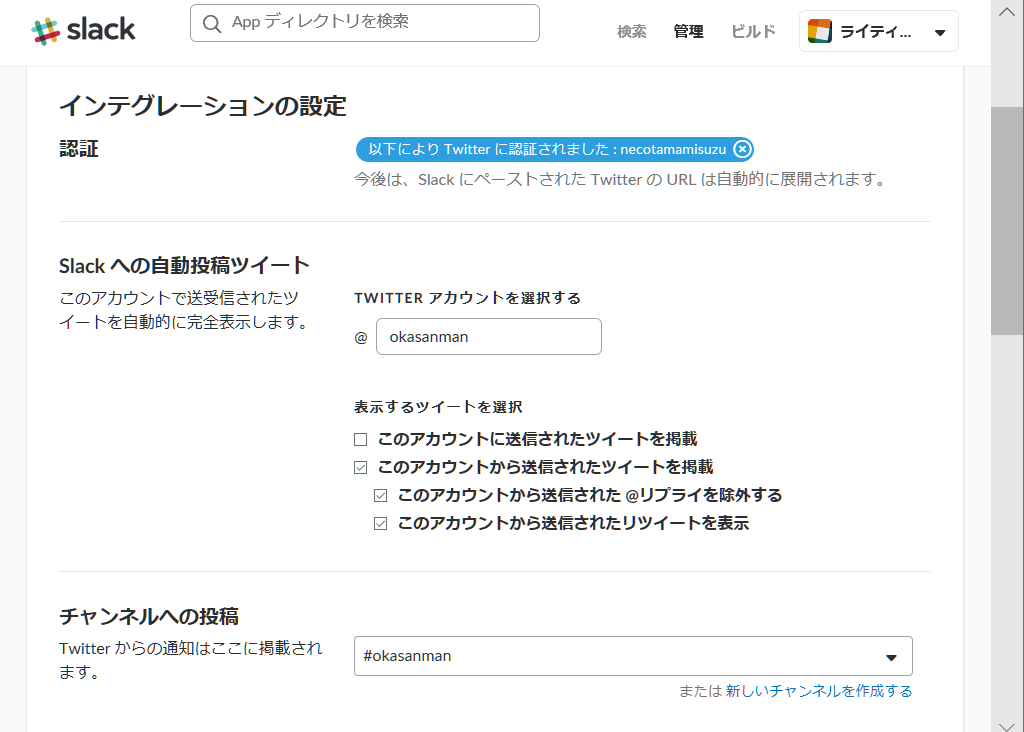 また「チャンネルへの投稿」では、どのチャンネルあるいはDMにTwitterのつぶやきを登録するか指定します。相応しいチャンネルがない場合は、この画面からチャンネルの新規作成も可能です。