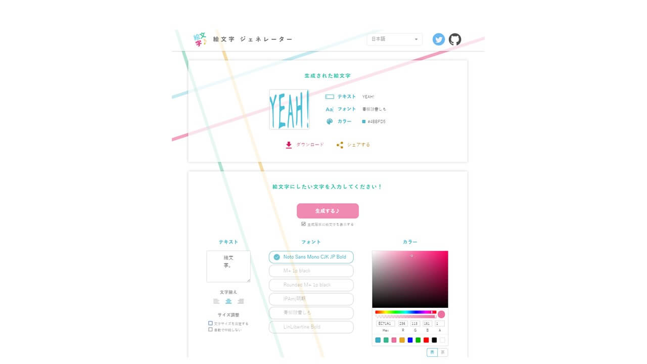 「絵文字 ジェネレーター」というサイトでは、絵文字に含めるメッセージとフォントと文字カラーと背景カラーを選択するだけで、かんたんに絵文字が作成可能です。