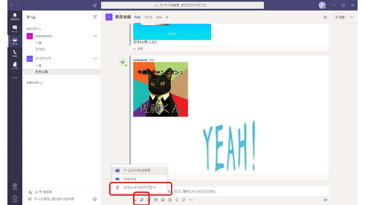 Teams内のメッセージ入力欄下の「添付」アイコンを選択し、「コンピューターからアップロード」から、先ほど作成しダウンロードしておいた絵文字画像を選択してください。
