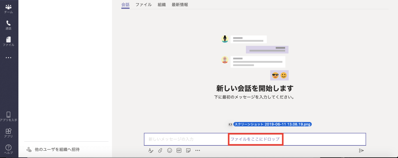 チャット画面からファイルを共有する場合は、ファイルをメッセージ入力欄にドラッグ&ドロップするだけ!