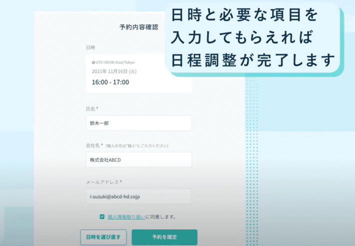 (4)日程調整をする相手が都合の良い日時を選んで会社名と名前とアドレスを入れると