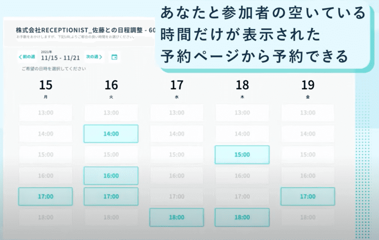 ズバリ、上記画像のように、特定のURLを日程調整する相手に送るだけで日程完了。それ以外は何もする必要ありません。