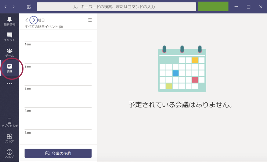 Teamsでライブ配信をする場合は、まずTeamsの「予定表」から「会議」を選び、イベントを作成します。