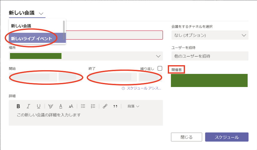 次に、「新しい会議」から「新しいライブイベント」に切り替えましょう。