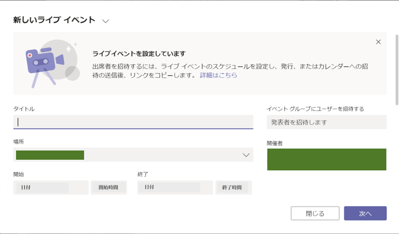 開催者の欄には発信者(ユーザー自身)を「プロデューサー」や「発表者」として設定。