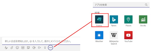 Microsoft Teamsでアンケートを作成する場合は、メッセージング拡張機能 その他のオプション 「…」ボタンから「Forms」を設定します。