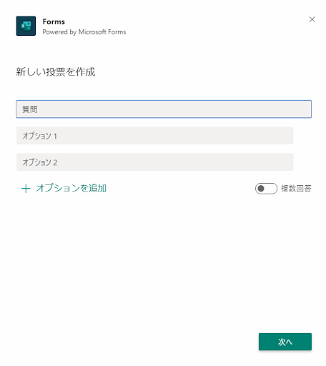 Microsoft Teamsのアンケート機能は非常にシンプルで、質問と選択肢が設定可能です。