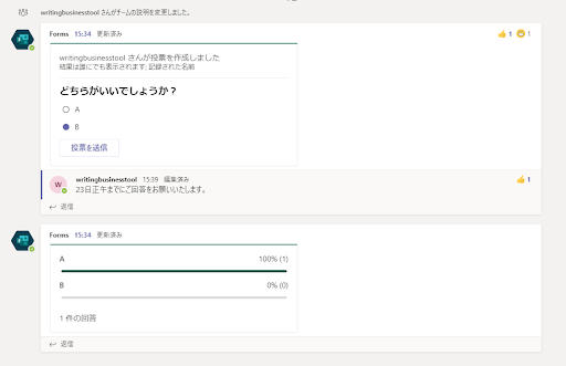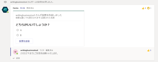 一方、Microsoft Teamsのアンケート機能は、スレッド内で全員が情報を共有しながら手軽に意思決定できる点が便利です。