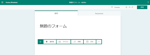 Microsoft Formsで設定できるのは「選択肢」「テキスト」「評価」「日程」です。その他ランキングやリッカー調査用のフォーマットなども用意されています。