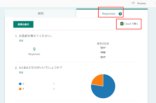 Microsoft Formsで作成したアンケートは、タブを切り替えるだけで簡単に表示できます。
