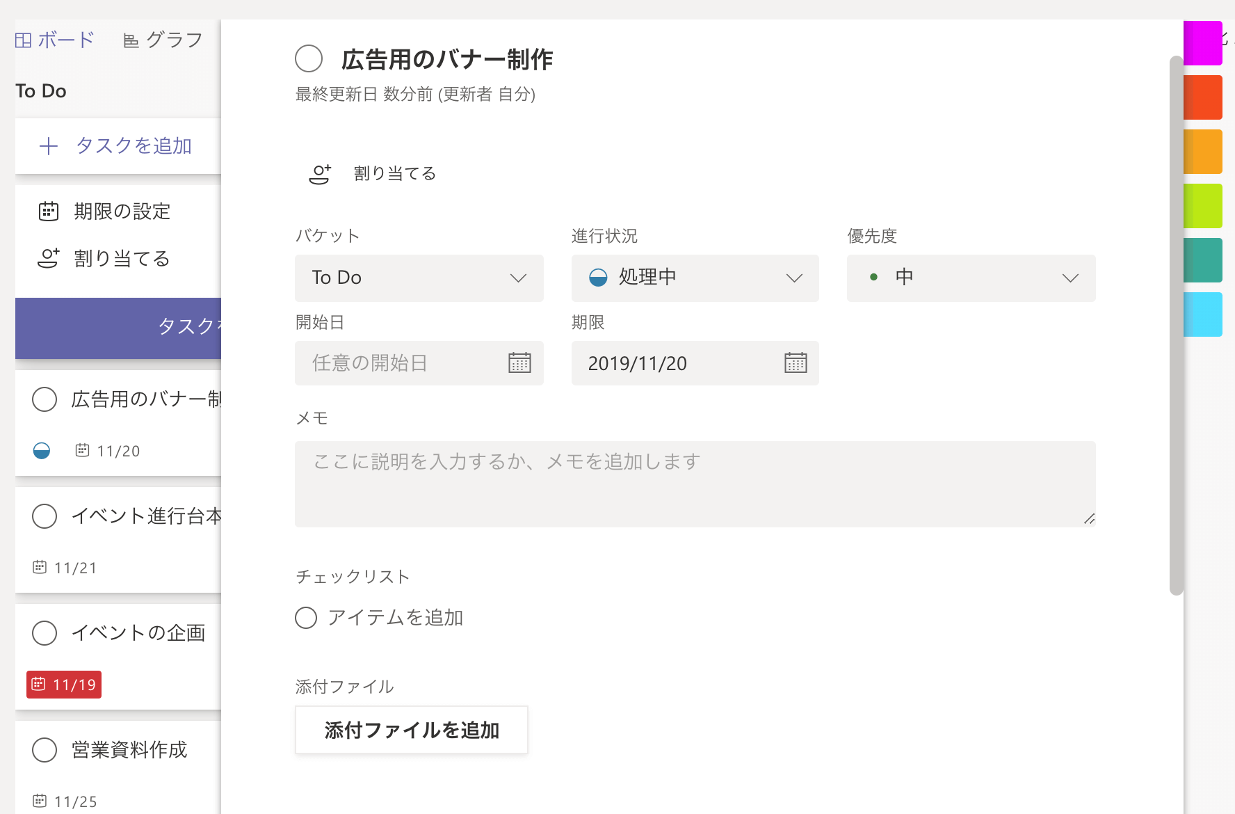 作成したカードをクリックすれば詳細の設定も可能です。進行状況や優先度の設定や、メモ書きを残すことができます。※Plannerの画面でも同様のことが可能です。