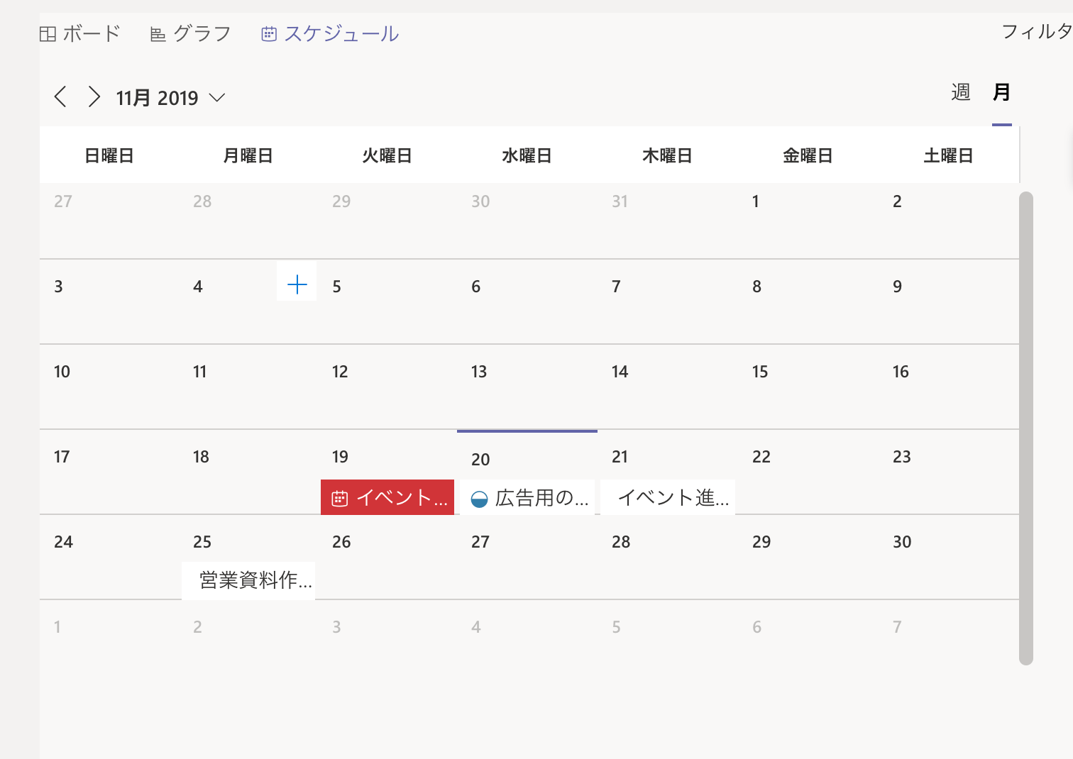 表示形式は、週単位・月単位とそれぞれで設定することができるので、週間、月間とそれぞれのタスクの見通しを立てるのに役立ちます。