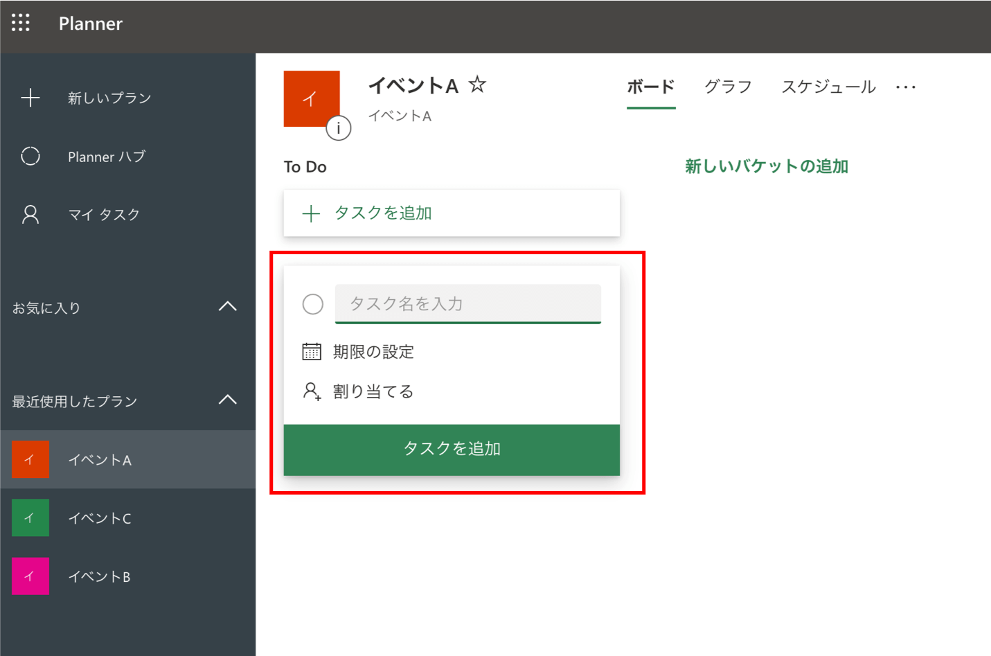 タスクの追加方法は、上記で「Planner」に追加したのとやり方は同じです。