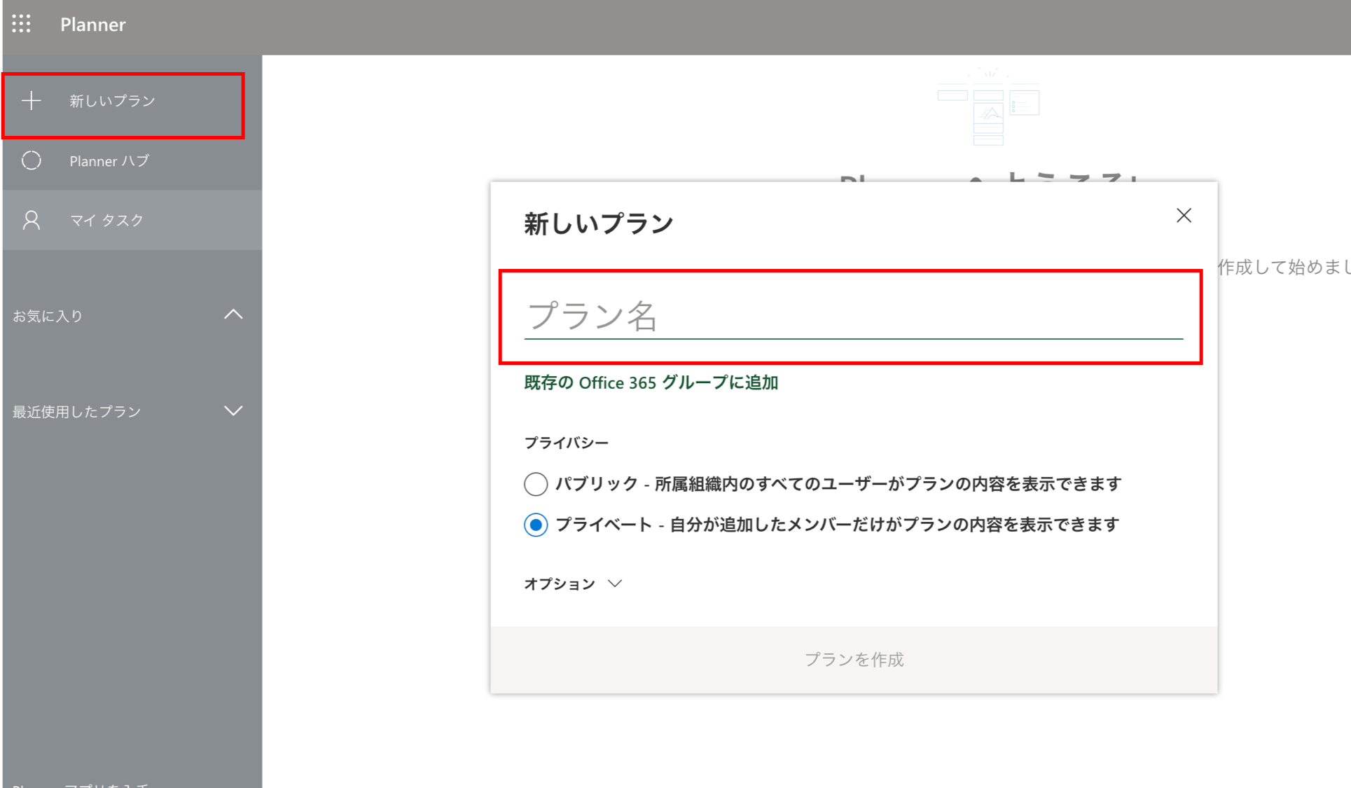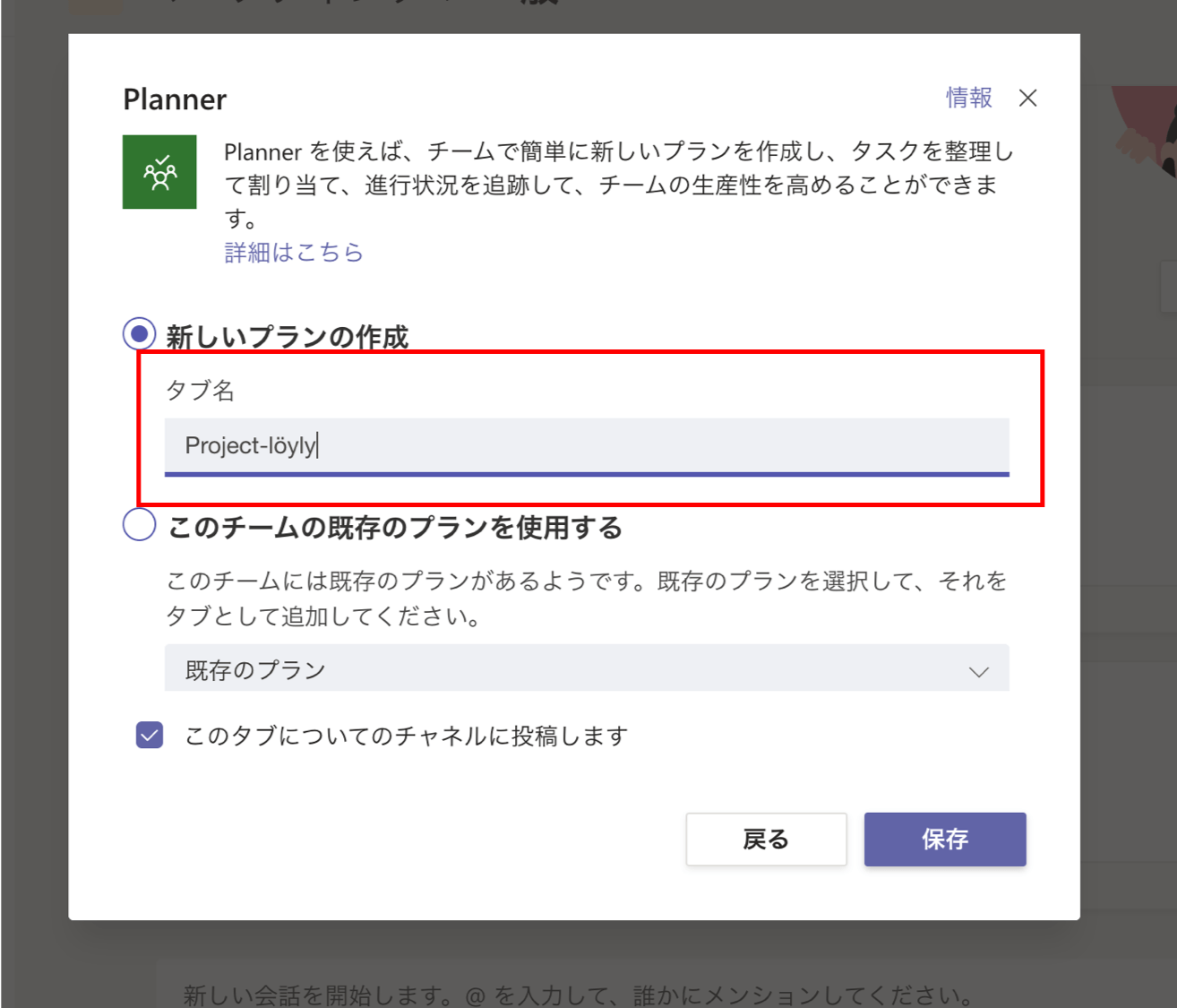 「Planner」をクリックすると「プラン」の作成画面が開きますので、プラン名を入力して作成すれば、チームスのチャネル上にプランが設置されるようになります。